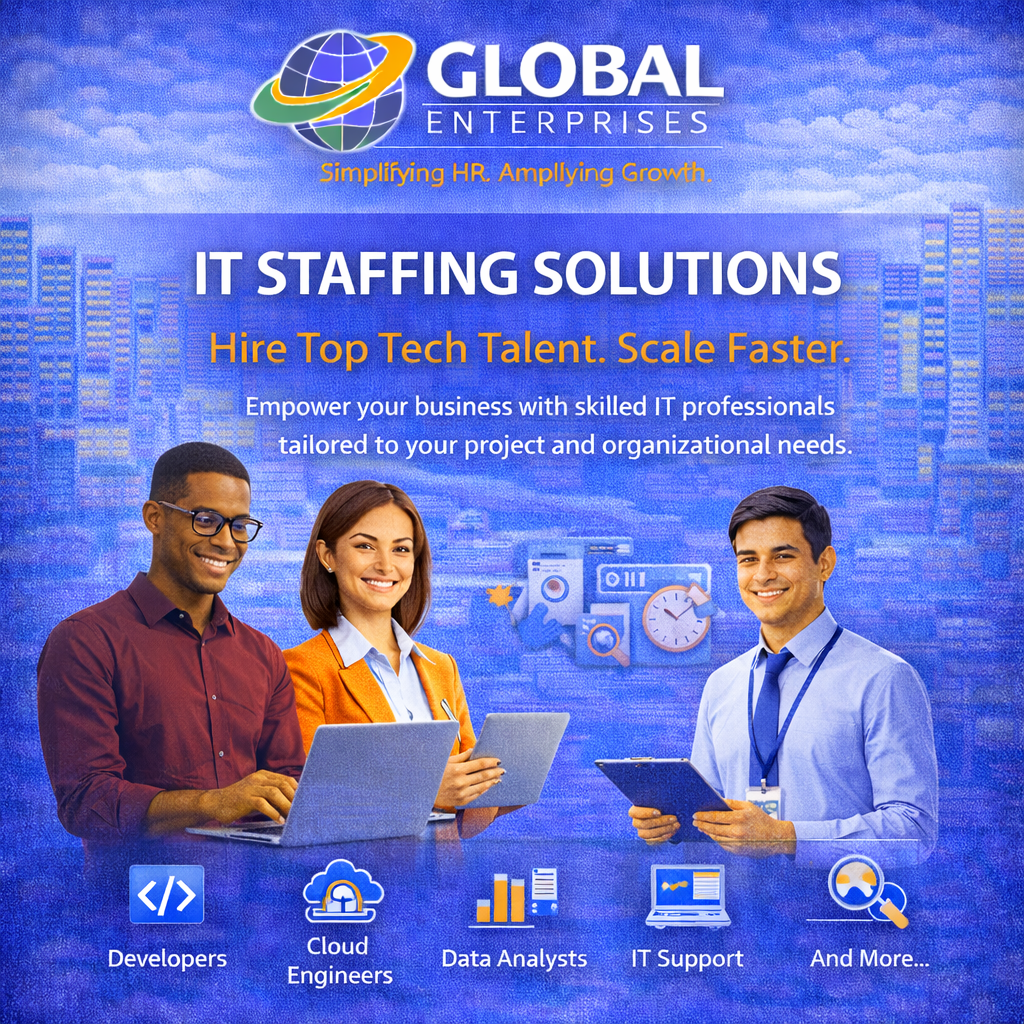 Empower your business with skilled IT professionals tailored to your project and organizational needs. IT Staffing is the process of hiring skilled technology professionals to support your business operations, projects, and digital transformation goals. At Global Enterprises, we provide highly qualified IT talent to help companies innovate, scale, and stay competitive in today’s fast-paced digital world.