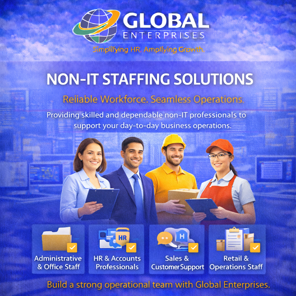 Non-IT Staffing involves hiring professionals for non-technical roles that are essential for business operations, administration, and customer interaction. At Global Enterprises, we specialize in providing reliable and efficient manpower across various non-technical roles, ensuring smooth business functioning and productivity. Providing skilled and dependable non-IT professionals to support your day-to-day business operations.