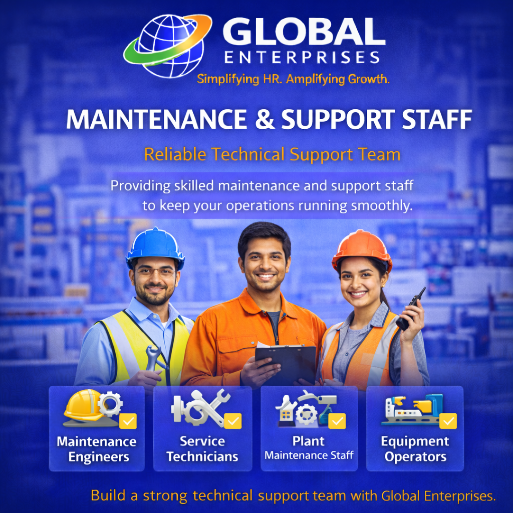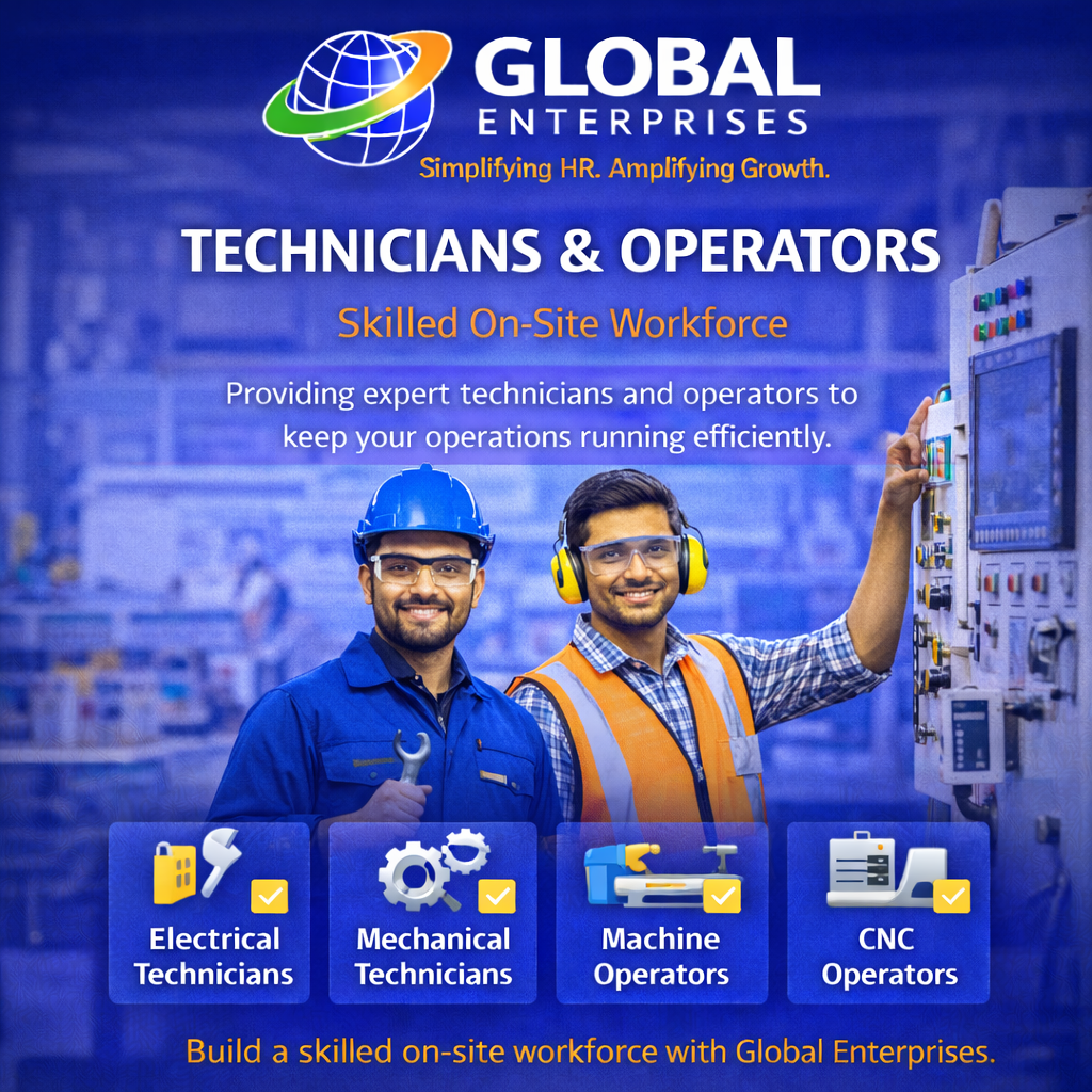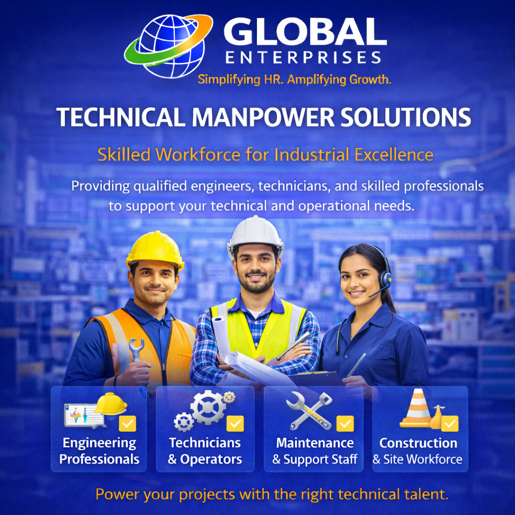 Providing qualified engineers, technicians, and skilled professionals to support your technical and operational needs. Technical Manpower refers to skilled professionals required for engineering, manufacturing, construction, and technical operations. At Global Enterprises, we specialize in providing experienced and job-ready technical professionals who ensure efficiency, productivity, and smooth execution of projects.
